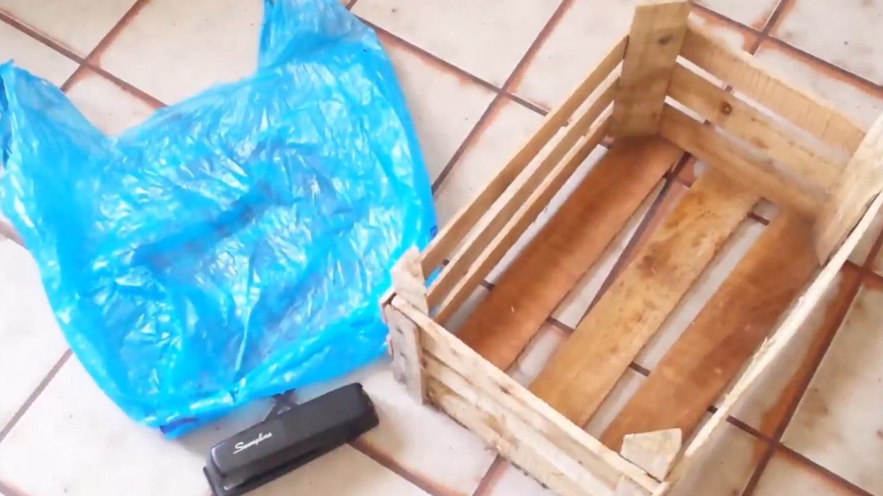 2. Una vez que el huacal esté seco, coloca la bolsa de plástico ajustándose a las dimensiones. Asegura con la engrapadora en los bordes superiores e inferiores.