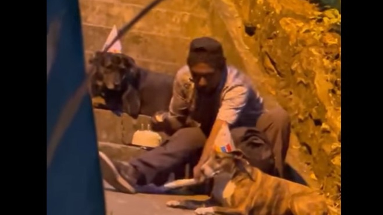 Con gorritos y mañanitas, este hombre que vive en la calle celebra el cumpleaños de su perrito