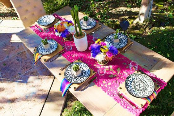 Si tienes algunas macetas bonitas con cáctus o suculentas, no dudes en reunirlas para usarlas como centro de mesa. Le darán un toque muy original y lucirán muy bonitas si las acompañas con un mantel bordado y muy colorido.