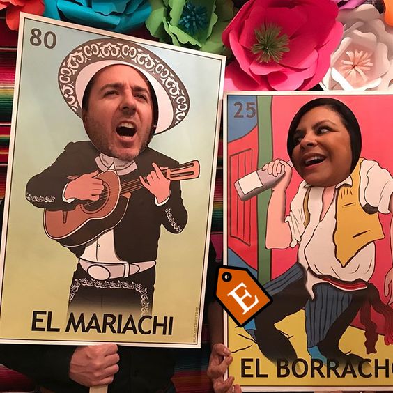 Y para las fotos… puedes imprimir en tamaño grande algunas imágenes tomadas de la tradicional lotería mexicana. Solo debes recortar un poco en el lugar donde irá el rostro y pegar sobre un cartón o papel cascarón.