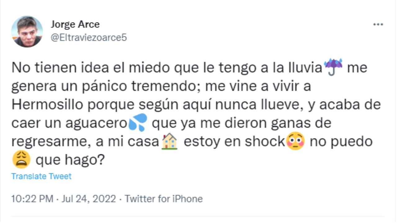 “No tienen idea el miedo que le tengo a la lluvia?? me genera un pánico tremendo; me vine a vivir a Hermosillo porque según aquí nunca llueve, y acaba de caer un aguacero? que ya me dieron ganas de regresarme, a mi casa? estoy en shock? no puedo? que hago?”, escribió el deportista.