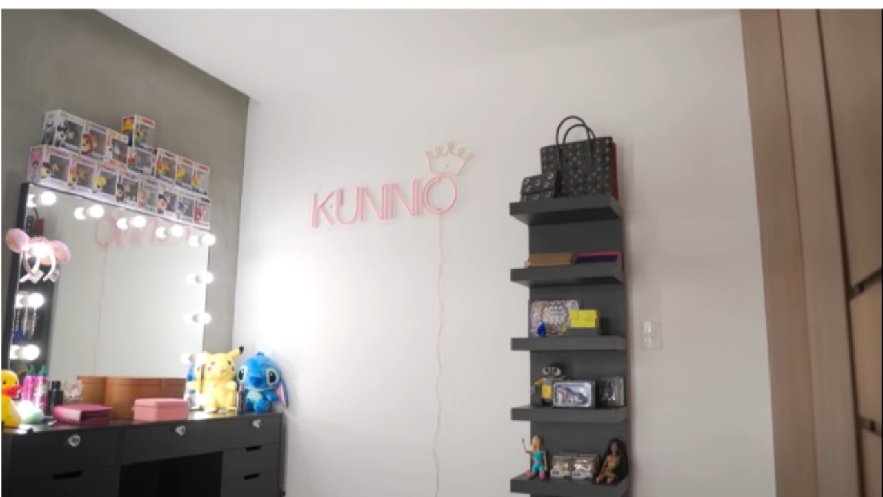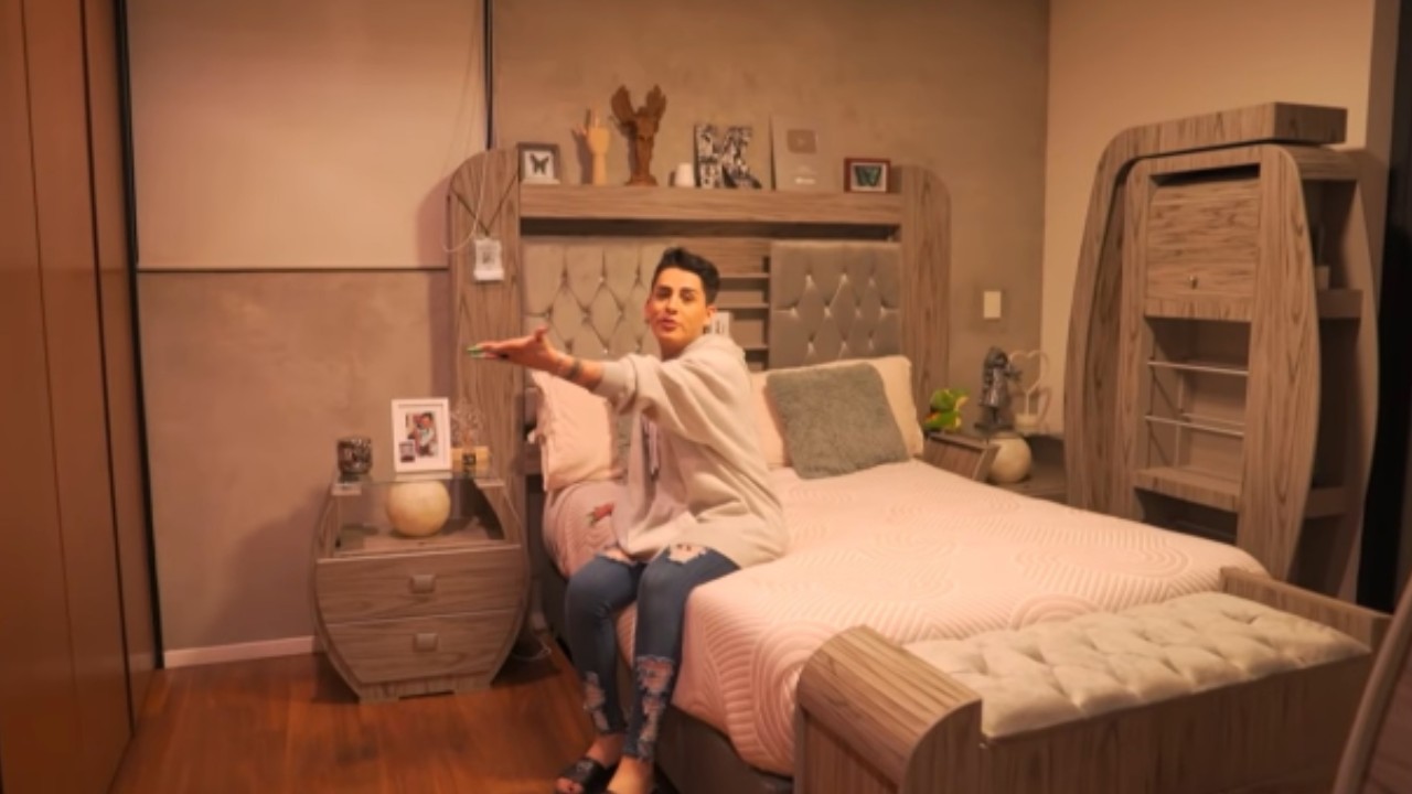 Su parte favorita, señala, es su sala de cine, donde tiene un gran y mullido sofá cama frente a una enorme televisión con calidad 4k. Además, mostró su habitación, decorada en tonos grises y café claro con cabecera capitoneada, fotografías de sus seres queridos y su placa de YouTube.