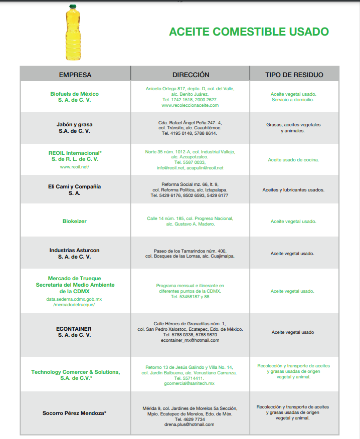 Esta empresa acepta residuos solo de aceite vegetal usado en la cocina, debes llevarlo en un envase de plástico bien cerrado para la producción de biodiesel, un combustible mucho menos contaminante.