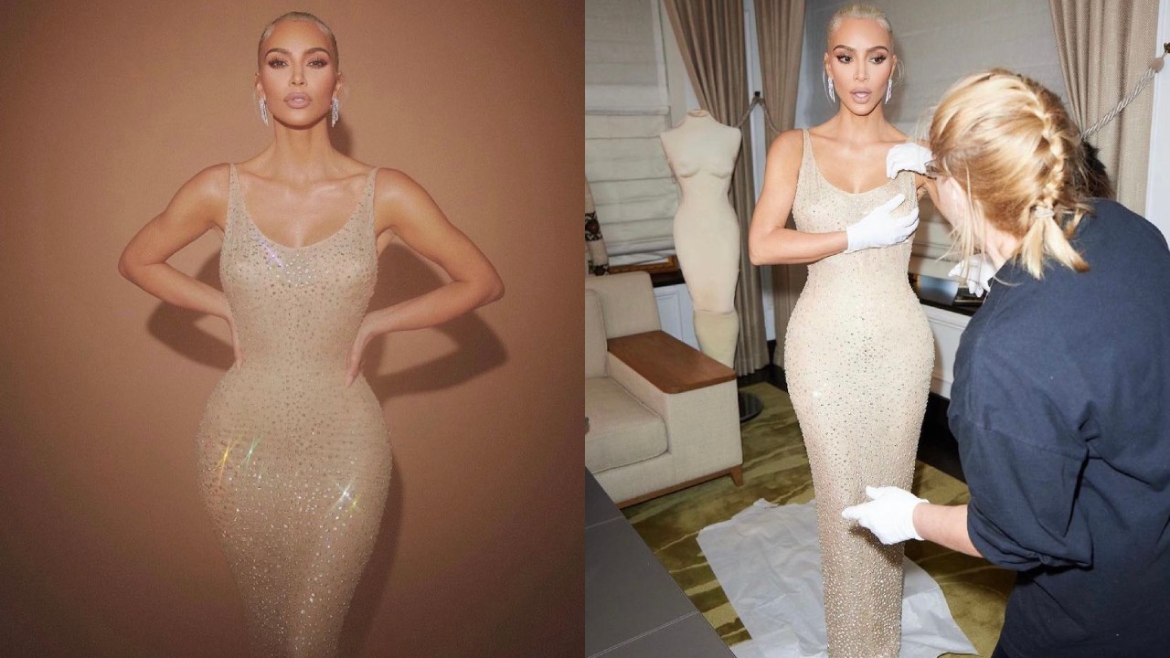 La empresaria y socialité usó un vestido original de la icónica Marilyn Monroe, el mismo que la bomba rubia usó para cantar ‘Happy birthday, Mr President’ el 19 de mayo de 1962 en el Madison Square Garden de Nueva York, sin embargo, este vestido se hizo a la exacta medida de Marilyn, quien tenía un cuerpo muy diferente al de Kim, empezando por la altura, pues la actriz medía 168 cm, mientras que KK alcanza los 157 cm.